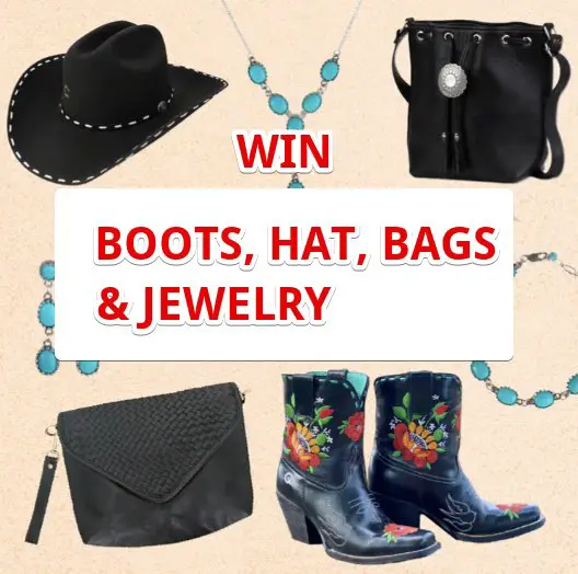 Prizes to win for one lucky winner includes a $388 Senorita Rosita Boots, Bucksnort Hat from Charlie1Horse valued at $220, a $440 Daybreak Jewelry Set, and the Bola Bag and Everyday Woven Bag from AMASOUK valued at $315.