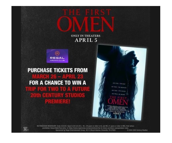 Check out the movie "The First Omen" using your Regal Crown Club card or click on the link below for a chance to win a trip for two to LA for a movie premiere in the future! The winner and guest will enjoy a three-night stay in LA with ground transportation, airfare and event tickets!