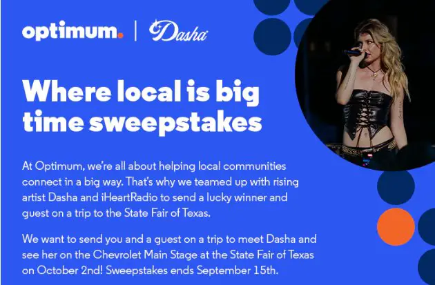 Six lucky winners will each be selected to attend the Texas State Fair in Dallas, TX. The trip includes hotel accommodation, airfare, fair tickets, $500 gift card, and a meet-and-greet with country pop singer, Dasha.