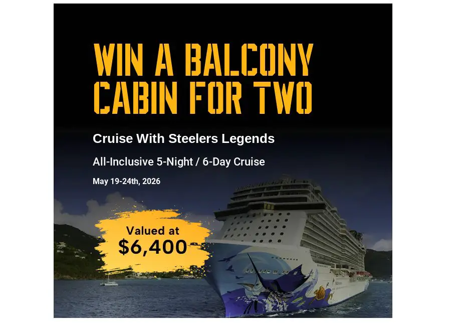 Enter now for a chance to win Steelers Fan Cruise for two from May 19-24, 2025! Enjoy a five-day cruise vacation with your fellow Steelers fans with food, drinks and activities made for fans of the team! The winner and guest will also receive t-shirts and welcome drinks!