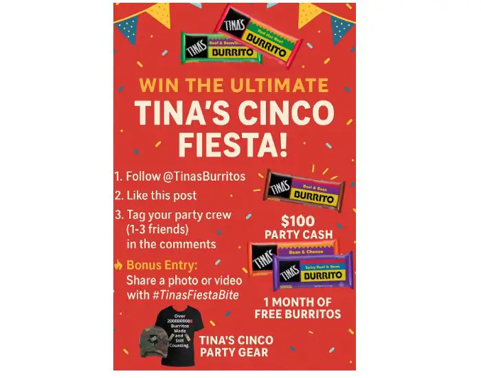 1 Winner: $100 Gift Card, One Month Supply of Tina's Burritos and Party SwagEntry Form