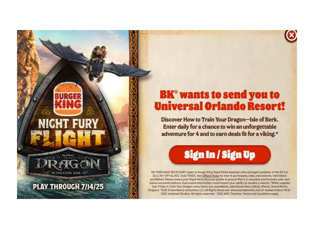 Burger King Night Fury Flight Sweepstakes & Instant Win Game - Win A Trip To Universal Orlando, Gift Cards Or An Instant Prize - Burger King
