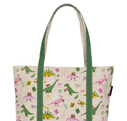 The tote bag up for grabs is a Dinosaur Reads large zippered tote.