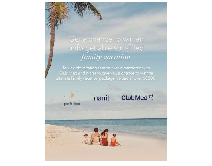 1 Winner: Club Med $7500 CAD Voucher Valid in Cancun or Ixtapa, A Nanit 5-Year Bundle with Flex Stand, Sound and Light Machine and Travel Case, Nanit 1-Year Milestones Insight Subscription and Petit Lem Swim Collection and Summer PJs Worth $500 CADEntry Form