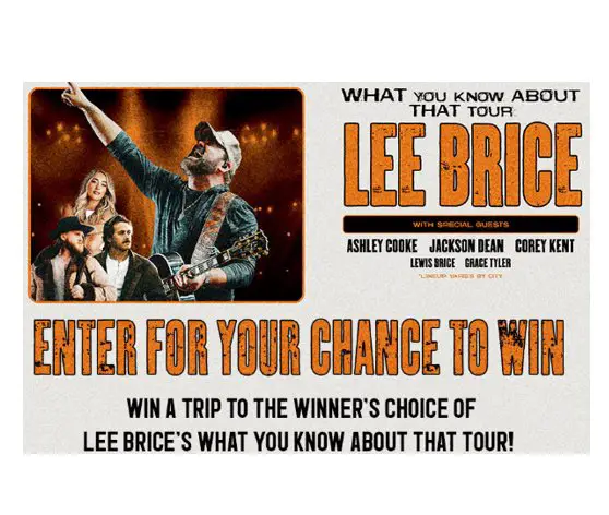 Enter The Lee Brice What You Know About That Tour Flyaway Sweepstakes for a chance to win a trip for 2 to any Lee Brice What You Know About That Tour concert within the forty-eight (48) contiguous USA and DC.