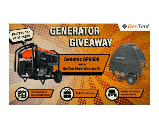 Enter the GenTent Generator Giveaway for a chance to win a 6,500 Watt portable generator, a Generator Tent, and a storage bag.