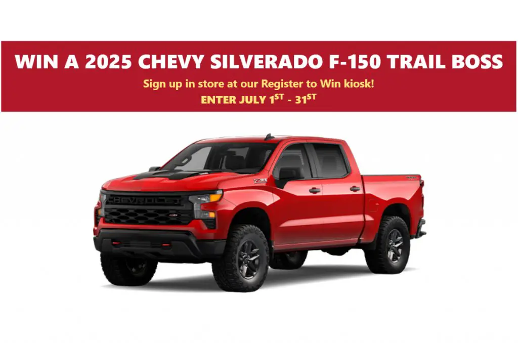 Enter now and you could be the grand prize winner of a brand new 2025 Chevy Silverado F-150 Trail Boss! You’ll never have to face a challenging road ever again using this powerful truck!