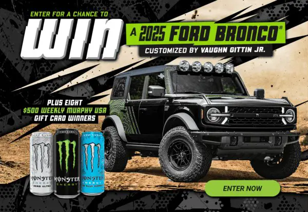 For a shot at winning either the Ford Bronco or the $500 Murphy USA Gift Card, simply visit the official entry page to enter. You may enter by making a qualifying Monster Energy purchase at a participating Murphy USA location. You will be required to provide your MDR account phone number at checkout.