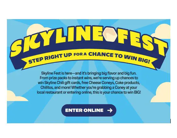 Eight grand prize winners will each score a $1,500 Skyline Gift Card! The sponsor will also reward multiple other winners with various prizes including free Cheese Coney, free Regular Coke Product, Regular Fries, Regular Chilito, free Cheese Coney w/ Coke purchase, and more.