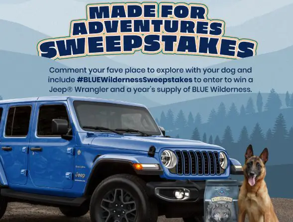 Enter the sweepstakes for a chance to win a 2025 Jeep Wrangler SUV and a 1-year supply of Blue Buffalo Wilderness dry dog food.