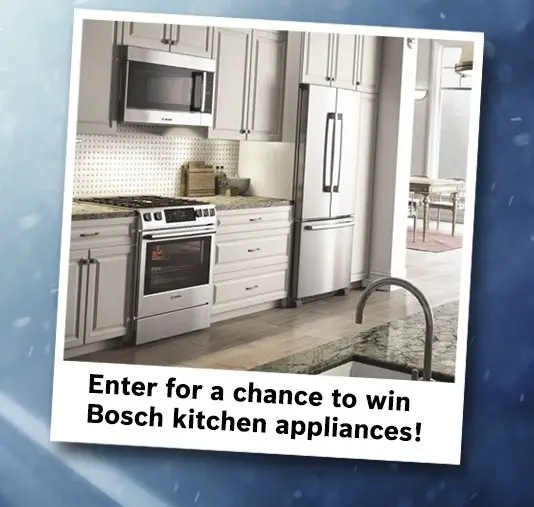 Win a $5,000.00 Bosch Kitchen 500 Series B11CB50SSS Bottom Freezer Refrigerator, Bosch 500 Series HMV5052U 1100W Built-In Microwave Hood Combo 2.1 cu ft Stainless Steel, Bosch 800 Series HGI8054UC Gas Slide-in Range, and Bosch SHX68T55UC 24" 800 Series Built-In Dishwasher!