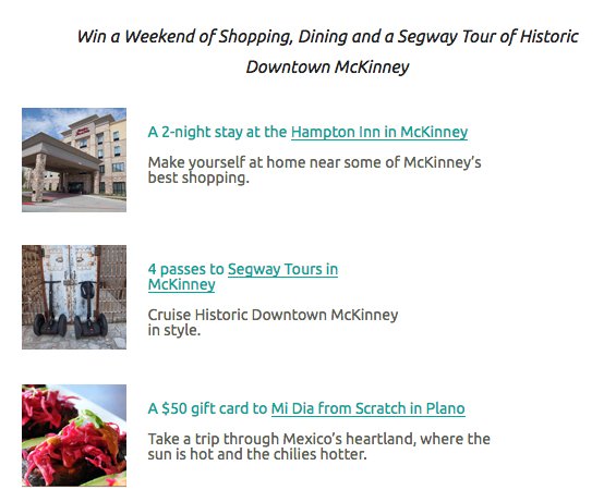 2-night stay at the Hampton Inn in McKinney; 4 passes to Segway Tours in McKinney; $50 gift card to Mi Dia from Scratch in Plano; $50 gift card to Roman Cucina in Allen; $100 gift card to the Apple Store in Frisco; $100 gift card to Orison’s Art and Framing in McKinney; and a $100 Visa gift card to shop in Plano.Entry Form