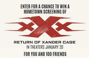A $2,000.00 screening of The Return of Xander Cage in or near the Sweepstakes winners hometown for the winner and up to 100 guests could be yours! Enter now.