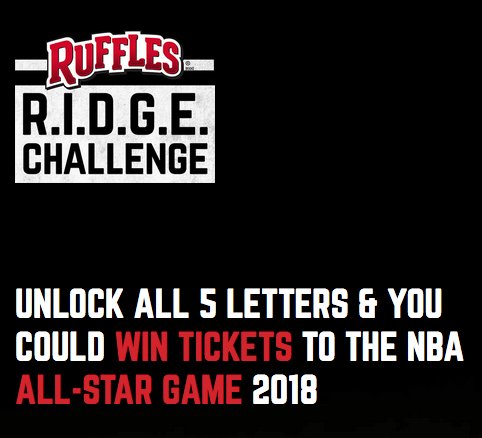To receive a free bag code for the Instant Win Game without making a purchase, call 1-888-859-4027 and follow the automated instructions. For each completed call, you will receive 1 free bag code. Limit 1 free code per person/day. CONTEST ENTRY: For each Entry Period, Ruffles brand will publish a Dude Perfect Inspiration Video on www.facebook.com/ruffles, https://www.instagram.com/ruffles, and/or https://www.twitter.com/ruffles inviting participants to submit a video of themselves taking an “All-Star Shot” mimicking the shot performed in the Dude Perfect Inspiration Video. The video must include the hashtags #RufflesRidge and #Contest and either a Ruffles product or the word “Ruffles” printed on a sign or piece of paper. You must submit a minimum of 5 total Contest Entries via the same social media platform (Ruffles Facebook brand page, Instagram, or Twitter) (regardless of the Entry Period) in order to be eligible for the Contest Grand Prize. Contest entries will be judged based on the following criteria: 40% Similarity to Dude Perfect inspiration shot; 30% Most memorable; 20% Ruffles product or sign placement; and 10% Video quality.