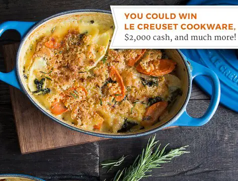 One $6,739.40 Grand Prize including: $2,000.00 in cash, $1,500.00 gift card to Le Creuset, $1,500.00 gift card to Stonewall Kitchen, and a 12-month membership to America’s Test Kitchen’s Online Cooking School.