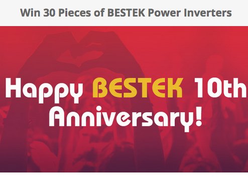 Bestek power inverter, $1000.00 in value for 30 winners. Today is the BESTEK ten-year anniversary. To reward BESTEK customers and fans, the sponsor has held the celebration carnival. Join them to get nice gifts.
