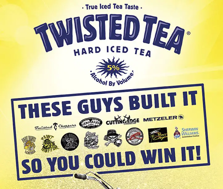 Winner will receive a Twisted Tea Custom Chopper worth $8,000.00. Submit a video explaining why you deserve the Twisted Chopper to enter.