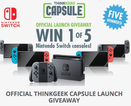 5 will win a $300.00 Nintendo switch console. ThinkGeek Capsule is a subscription service that delivers new limited-edition geeky items to your home every month.