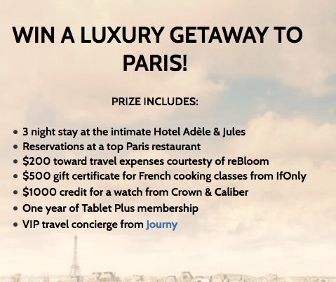 Enter to win a 3 night stay in Paris with a $200 travel voucher, a $1,000 Crown & Caliber credit to buy a watch, a $500 IfOnly gift certificate and more. $2,000.00 value in all.