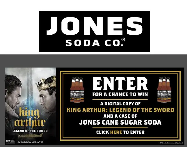 20 will win in the Jones Soda King Arthur Sweepstakes a case of Jones Soda and a Digital UV copy of the film King Arthur worth $80.00 each.