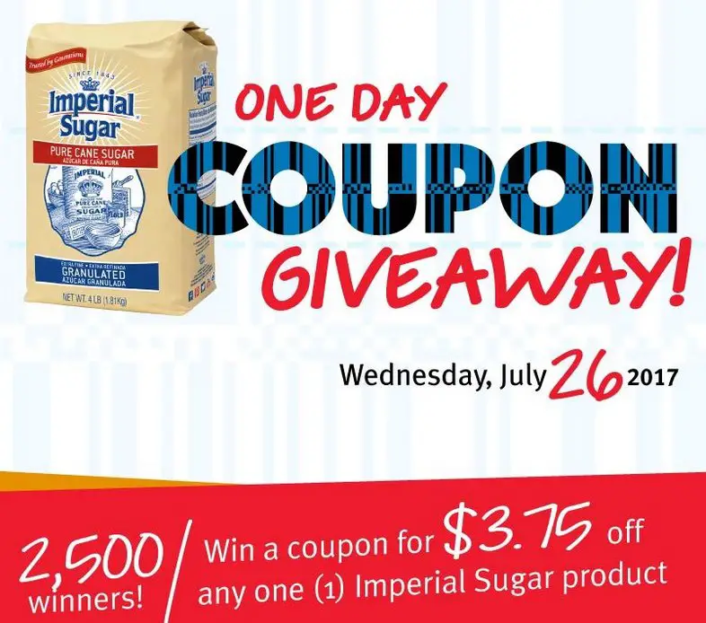 Grand Prize for 2,500 winners, a $3.75 Coupon for a free Imperial Sugar product. Enter to win a coupon for free sugar by completing the entry form.