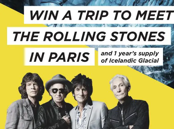 You can win a three night stay at a hotel in Paris, two VIP tickets which include premium seats and a meet and greet with The Rolling Stones, and one year’s supply of Icelandic Glacial water. $7500.00 value!
