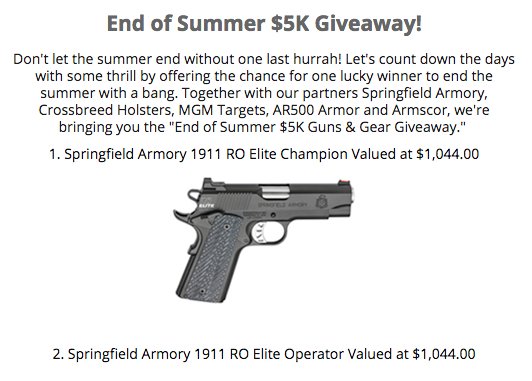 $5,000.00 in sporting good prizes like a Springfield Armory 1911 RO Elite Champion. Open to all individuals over the age of 21 and who are legal residents of the United States at the time of entry, except as follows: Residents of New York, Florida, California and Rhode Island are ineligible to participate or win.