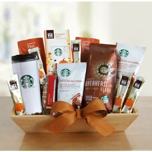 Grand Prize is a $115.00 Starbucks Pumpkin Spice Shades of Autumn Gift Basket. This Autumn treasure is sure to put a smile on your face. This natural wooden crate features: 1 – Starbucks Travel Mug; 1 – Starbucks Breakfast Blend Coffee Coffee 2.5 oz; 1 – Starbucks House Blend Coffee Coffee 2.5 oz; 1 – Starbucks Gingerbread Biscotti 1.8 oz; 2 – Starbucks Salted Caramel Hot Cocoa; 1 – Starbucks Pumpkin Spice Via Coffee.