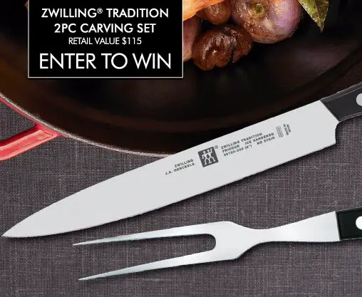 Win a Tradition 2-piece carving set, worth $115.00. Get ready for turkey carving with our ZWILLING Tradition 2PC Carving Set. Included is an 8" Slicing Knife and a 6" Carving Fork.