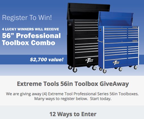 Enter and win a $2,700.00 Extreme Tools 56” Professional Toolbox that ncludes 11 drawer rolling cabinet and 10 drawer top chest. Use Code: TOOLBOX