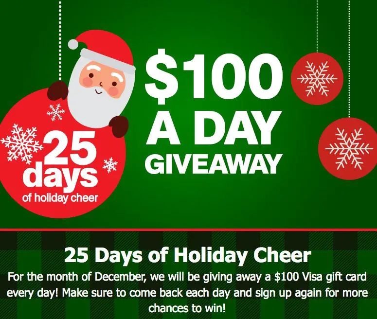 Winner will receive a $100.00 Visa Gift Card each day in December, for a total of 31 winners. Individuals can enter once per email address every 24 hours.