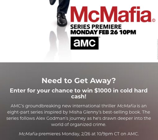 $1000 cash can be yours! AMC’s groundbreaking new international thriller McMafia is an eight-part series inspired by Misha Glenny’s best-selling book. The series follows Alex Godman’s journey as he's drawn deeper into the world of organized crime.