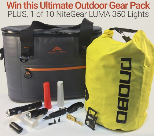 Win a $500.00 outdoor prize pack including a NiteGear Luma 900 Flashlight Package, NiteGear Luma 350 Flashlight Package, Ozark Trail Jumbo Tote Premium Cooler, Dnobo 15L Waterproof Kayak Bag, Get-A-Way Driver Keychain, Money Clip with Bottle Opener, Aluminum Key Holder, and Wallet Card Multi-Tool. Ten additional prizes of a NiteGear LUMA 350 Flashlight Package.