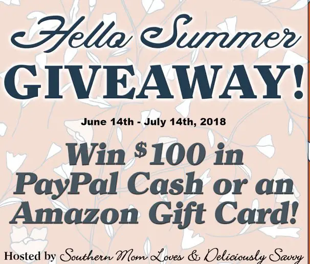 Enter for a chance to win $100.00 in your choice of Paypal cash or an Amazon gift card for your summer fun from Southern Mom Loves and Deliciously Savvy! Giveaway begins on 6/14/2018 at 1:00 am CST and ends on 7/14/2018 at 11:59 pm CST.