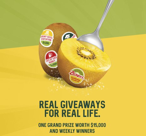 Zespri SunGold Kiwifruit is the real snack for real life, so we’re giving away awesome prizes to make your real life easier. Enter daily for a chance to win the $15,000.00 grand prize, weekly prize packs, and grocery gift cards with Zespri SunGold Kiwifruit.