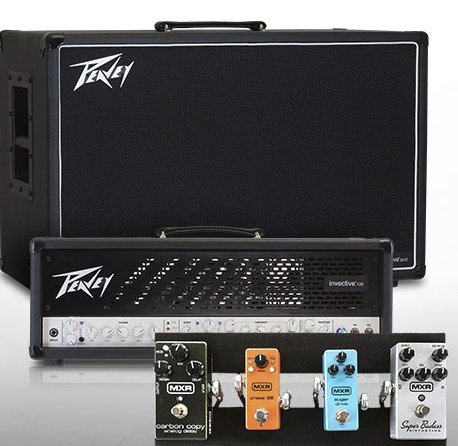 Peavey Invective 120 120W Guitar Amplifier Head, Peavey Invective 212 2x12 Guitar Speaker Cabinet, MXR Carbon Copy Guitar Effects Pedal, MXR Sugar Drive Guitar Effects Pedal, MXR Super Badass Distortion Guitar Effects Pedal, MXR Phase 95 Guitar Effects Pedal, and Pedaltrain Nano Pedalboard.Entry Form