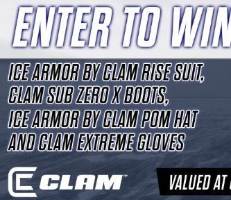 You will be all set for the ice season with your $650.00 prize package that includes the all-new Ice Armor by Clam Rise Suit, Clam Sub Zero X Boots, Clam Pom Hat, and Ice Armor by Clam Extreme Gloves.