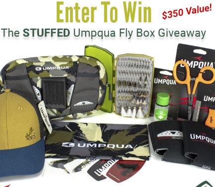 Enter to win a $350.00 Fly box with sixty-eight flies, Umpqua Wader ZS Chest Pack, UPG LT Standard Fly Box, Umpqua River Grip Big Nip TC, Umpqua Rivergrip Scissor Forcep, Umpqua Shimazaki Dry Shake Fly Floatant, Umpqua Hat, Umpqua Koozies, Umpqua Neck Gaiter, and Sticker Pack. Wow!