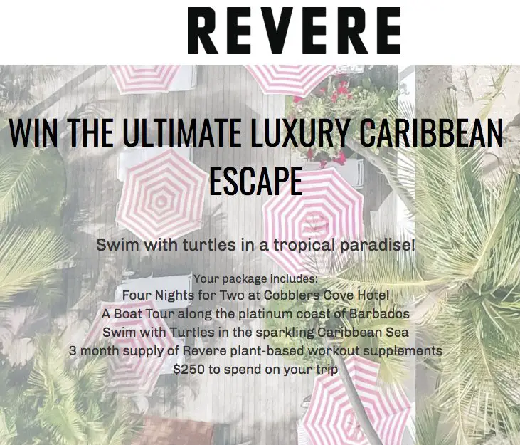Win a $3,000.00 4 Night stay for Two in a Garden Suite at Cobblers Cove, Barbados; complimentary daily breakfast at the resort; Complimentary Boat Tour of Barbadian coast; guided swim with turtles for two (2); 3 month supply of Revere plant-based workout supplement, and $250 Visa prepaid gift card, or equivalent.