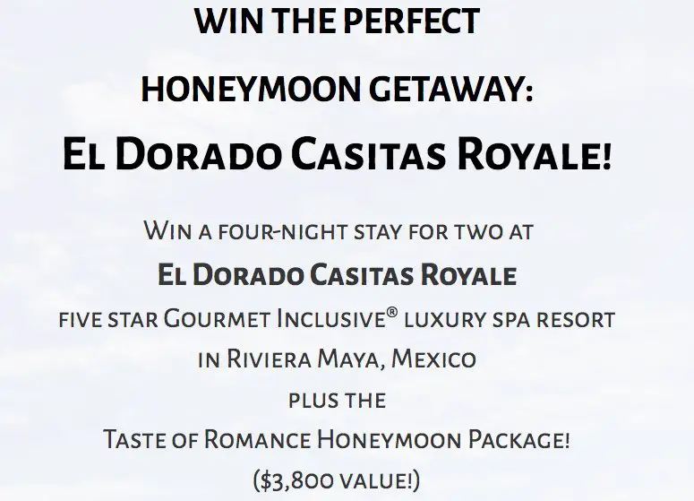 Grand Prize is a $4,900.00 5-day/4-night stay for two at El Dorado Casitas Royale in Riviera Maya, Mexico, Taste of Romance Honeymoon package, all meals, drinks, gratuities, taxes related to accommodations, non-motorized water sports and entertainment, $400 Brilliant Earth credit, $150 to Woman Getting Married, $100 VISA gift card, $200 to bricstore.com, and Biolage products.