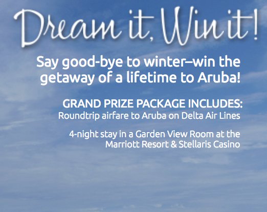 Win a $3,870.00 Prize package includes roundtrip Main Cabin airfare for 2 to Aruba, valued up to $685 per person, hotel accommodations for a 4 night stay in a Garden View Room at the Aruba Marriott Resort & Stellaris. Enter now!