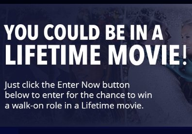 Grand Prize is a $4,500.00 4-day/3-night trip for 2 to a location TBD; transportation to/from airport/hotel; a $1,000 American Express gift card for food & incidentals; and a non-speaking extended extra role in a Lifetime movie of Sponsor's choosing. Enter now.