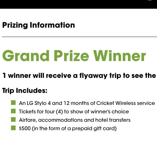 Score a $5,000.00 trip & tickets for 4 to Live Nation produced/promoted concert in the US; $500 prepaid card, LG Stylo 4 Movile device and 12 months of Cricket Wireless Service with Unlimited plan.