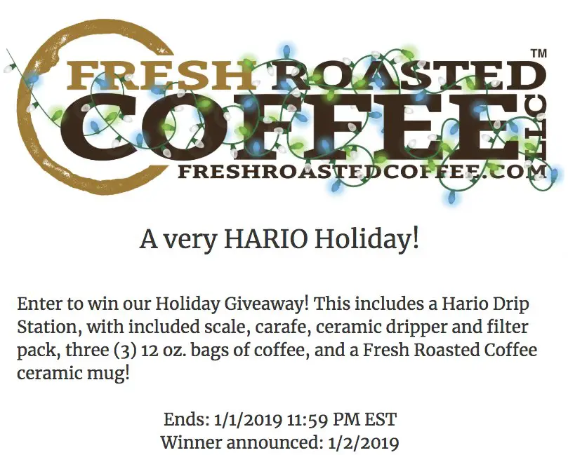 Grand Prize: A $100.00 Hario Drip Station, with included scale, carafe, ceramic dripper and filter pack, 12 oz. bags of coffee, and a Fresh Roasted Coffee ceramic mug!