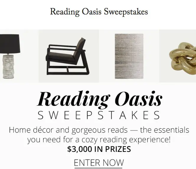 Win a Reading Oasis package worth over $2,700.00! Cement Mini Lamp, Azrou Steel Rug in 8x5, Brass Chain Knot, Heron Chair, and copies of The Outsider, Cloud in the Shape of a Girl, The Dark Between Stars, The Clockmaker’s Daughter, The Lost Queen, The Library Book, All the Light We Cannot See, Sing Unburied, Sing, Taking the Arrow Out of My Heart, The Tea Girl of Hummingbird Lane, The Rules of Magic, and The Death of Mrs. Westaway.