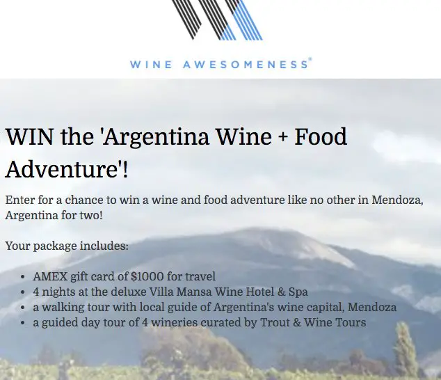 Score a $3,000.00 Wine Tour of Mendoza, Argentina with all of these benefits, just enter to win.
