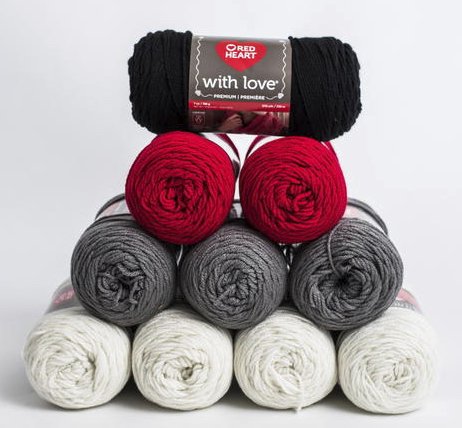 10 skeins of Red Heart With Love Yarn: 4 skeins in Eggshell, 3 skeins in Pewter, 2 skeins in Holly Berry and 1 skein in Black.Entry Form