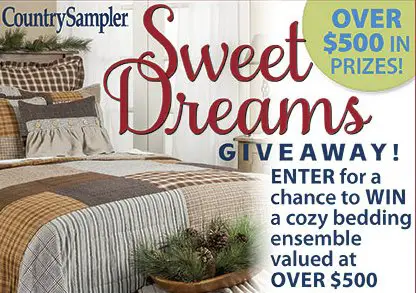 Grand Prize is a $500.00 Rory Quilt set, Wamsutta queen sheet set, and sham pillow inserts. Explore the pages of Country Sampler for inspiration to bring gorgeous country style to your home, and enter for your chance to WIN!