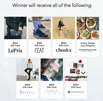 Grand Prize: $300 Amrita Singh E-Gift Card, $300 Chooka Gift Card, $300 Bobeau Gift Card, $300 Feat Socks Gift Card, $300 LePrix Gift Card, $300 Nations Photo Lab Gift Card, and 14-Day Personal Trainer Food Weight Loss Program.